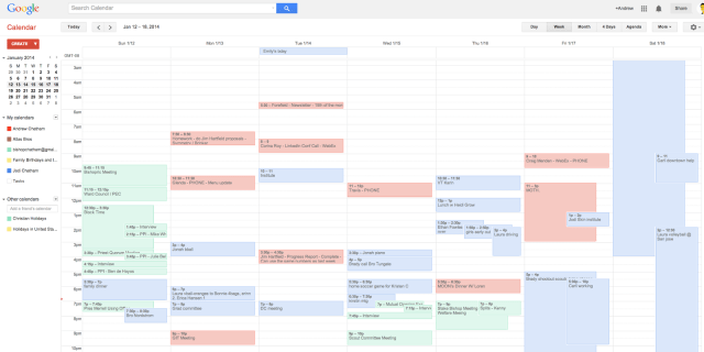 Google calendar is amazing! Blue is family, Red is work and Green is church.