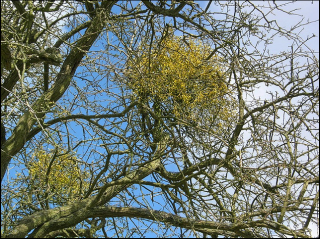 Upon the branches I saw a few clumps of a different kind of growth. A dark green bunch of leaves – mistletoe. Mistletoe is a type of parasitic plant that attaches to a host plant and then obtains its nutrients from that host.